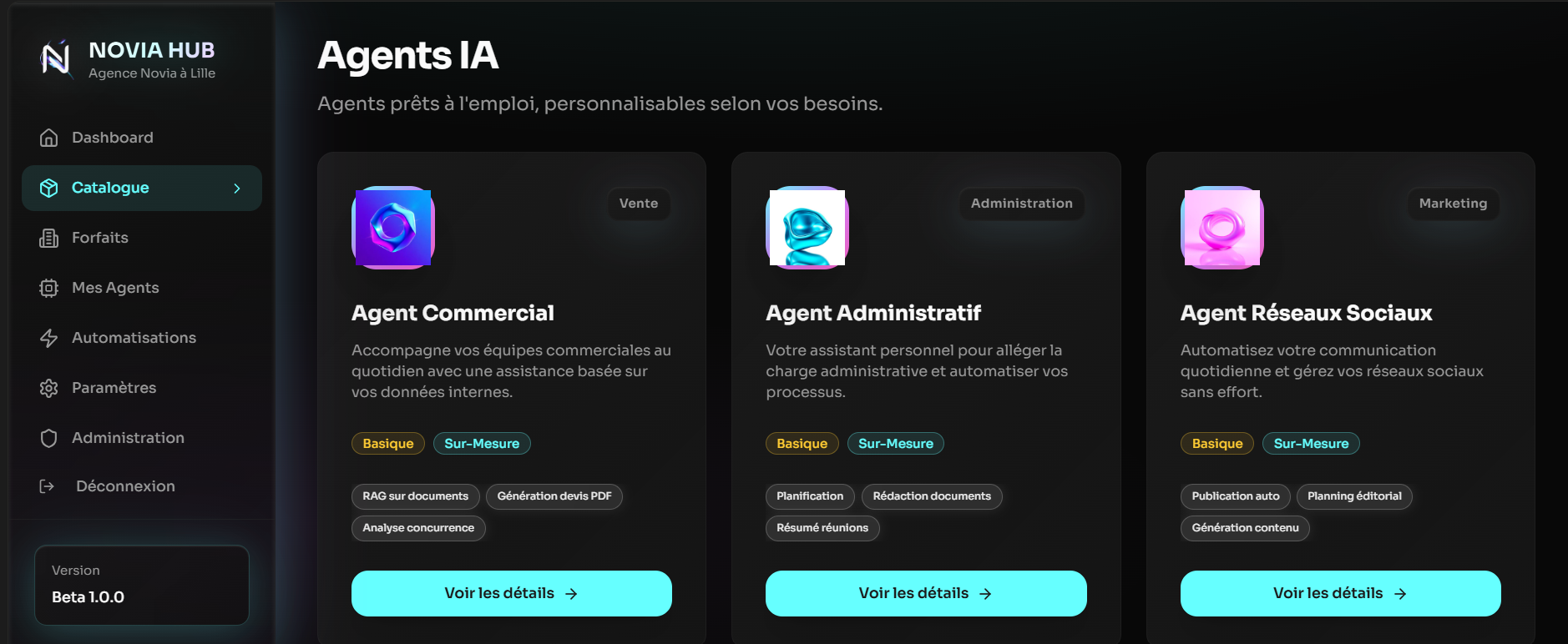 Pilotez votre écosystème Novia, gérez vos agents IA et automatisations avec une plateforme nouvelle génération